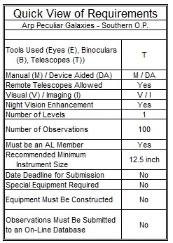 Assisting Al Lamperti in the development of this program were other members of the Delaware Valley Amateur Astronomers: John Bajtelsmit, Mark Huss, Vince Scheetz and Frank Colosimo, whose image of the galaxy is used on the certificate and pin. A special thanks to Barry Madore who advised how to navigate the NASA Extragalactic Database (which he helped develop) to retrieve the parameters of the Southern Arp galaxies needed.