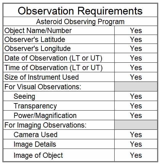 Submitting for CertificationTo receive your certificate and pin, you should send a copy of your observations along with your name, mailing address, email address, phone number, club affiliation, and to whom the certification should be sent to the Asteroid Observing Program Coordinator. You may also have them reviewed and approved by an officer of your local astronomy club who should then send an email to the Observing Program Coordinator. Note: If you are approving a submission for the Coordinator, it is critical that you tell the Coordinator which type of certification you are requesting. Be sure to indicate the type of certification as: