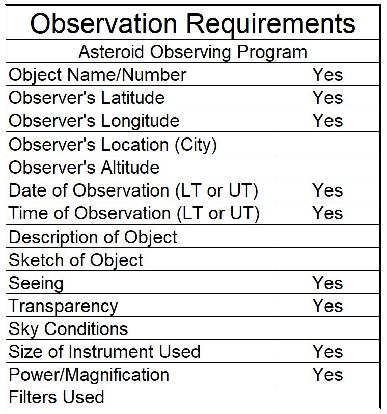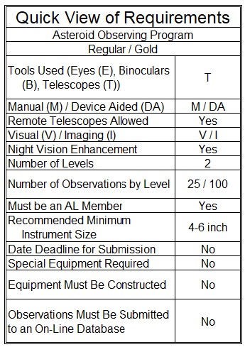 The Asteroid Observing Program offers two levels of awards as shown below. Next to each level there is listed the minimum size telescope that may be needed to observe the specified number of asteroids.