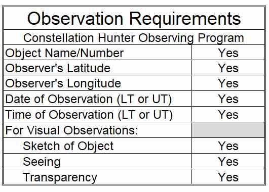 To qualify for the Astronomical League's Constellation Hunter certificates and pins, observe and sketch all of the constellations that are included on the checklist that you are pursuing. No equipment is required other than a planisphere and reference information of the names of major stars and constellation boundaries. Binoculars, while not required, will give you a deeper look into the star fields that you sketch. You should not include these additional stars and objects on your sketches, but the view will give you an appreciation for all of the things that await you in the other Astronomical League Observing Programs. You should proceed constellation by constellation. For each constellation, you need to provide this data: