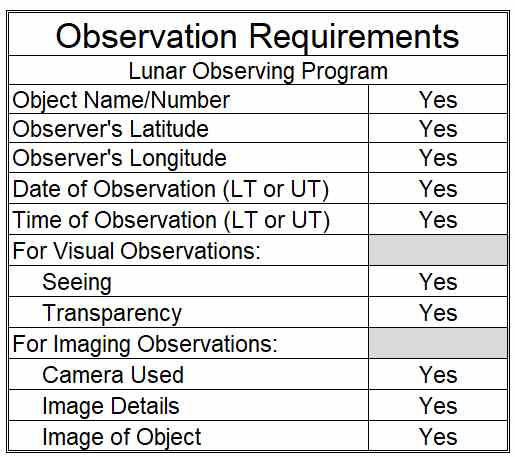 For information on which lunar features to observe, review the Lunar Observing Program (pfd file or Excel file).