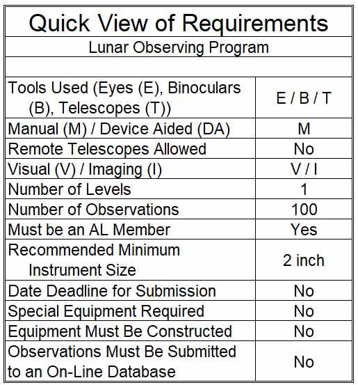 - The Astronomical League Web Store has a great manual available with information for all three AL Lunar Observing Programs. It is called Carpe Lunam, and is available here.