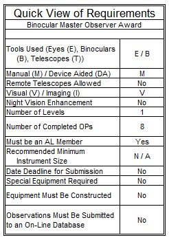 Requirements and RulesThis certification is available to members of the Astronomical League, either through their local astronomical society or as members at large. If you are not a member and would like to become one, check with your local astronomical society, search for a local society on the Astronomical League Website (click here), or join as a member at large (click here). The Binocular Master Observer Award will be given to an AL member who has completed at least eight of the League's binocular-based observing programs: