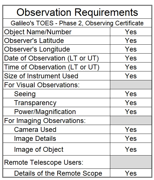 Submitting for CertificationThis program has a certificate (only) for those who successfully complete all of the required observations. Once you have made the necessary observations, either send a copy of your log to the Galileo's TOES Award Coordinator, or have it reviewed and approved by an officer of your local club. That officer should then send an email to the Galileo's TOES Award Coordinator with the observer’s name, club, e-mail address, and mail address. Also send the name and email address of the person to whom the certificate should be sent. |