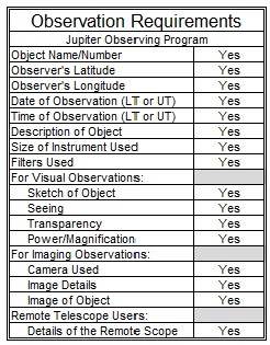 - Jupiter Observing Program Checklist: PDF format, Excel format
