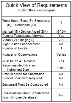 Welcome to the Jupiter Observing Program of the Astronomical League. Participation in this program will enhance your observing skills, and upon its completion you will have contributed scientific observations which will be available to those who can use them for scientific analysis. Jupiter's ever changing face is fascinating to observe, and the sense of personal accomplishment in observing it can be great.
