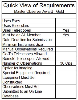 The Master Observer - Gold Award will be given to an AL member who has completed the Observer Award, the Master Observer Award, the Advanced Observer Award, the Master Observer - Silver Award, and the ten additional required Observing Programs for a total of 30.  If imaging is an option for completing an Observing Program then it is acceptable as part of the Master Observer - Gold Award.