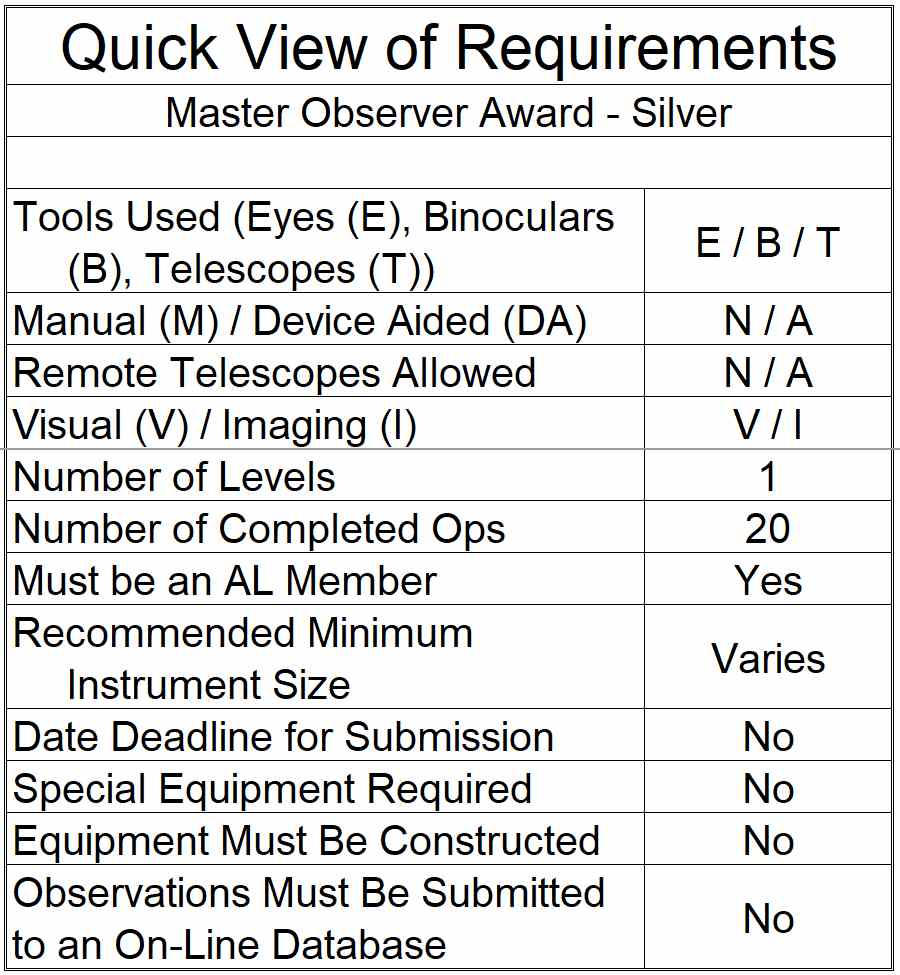 The Master Observer - Silver Award will be given to an AL member who has completed the Observer Award, the Master Observer Award, the Advanced Observer Award, and the five additional required observing programs. If imaging is an option for completing an Observing Program then it is acceptable as part of the Master Observer - Silver Award.
