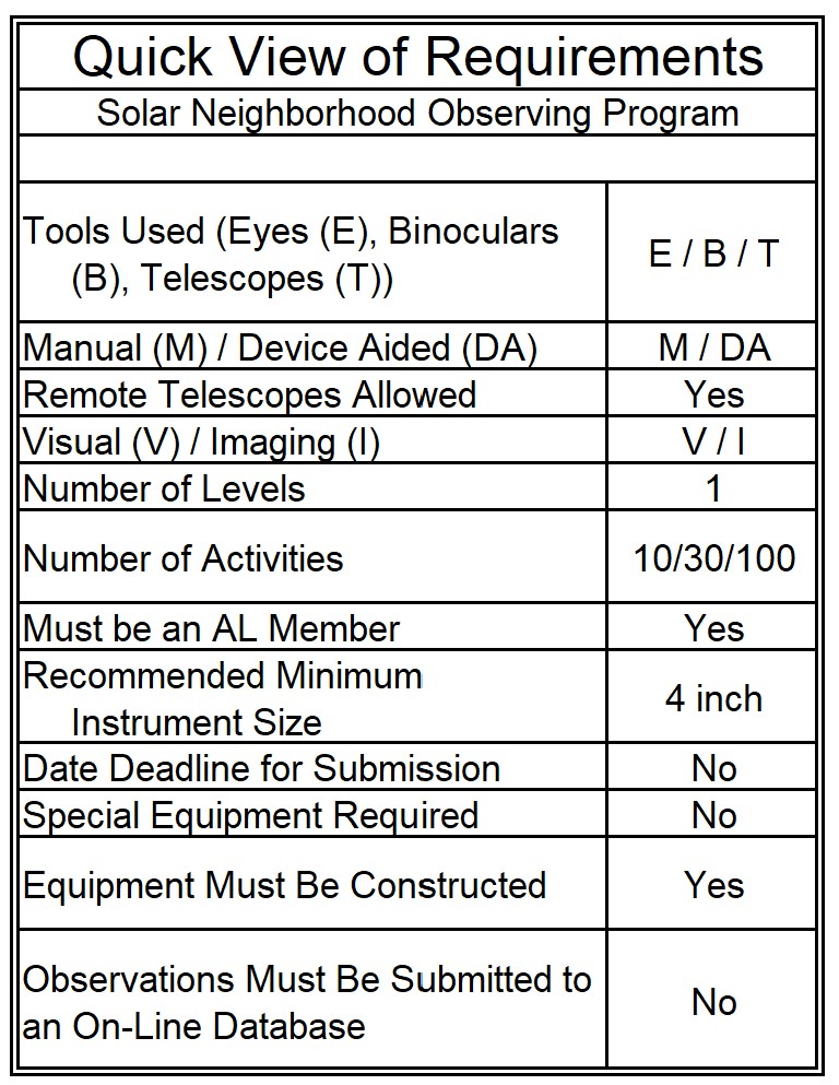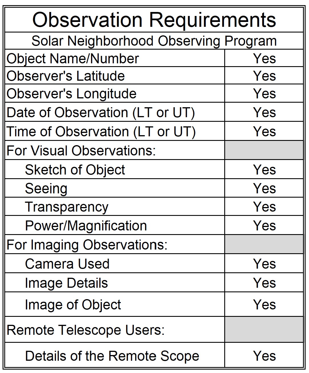 To complete the program, the participant must simply observe and log the required number of the nearest stars featured on the observing list and perform the three additional tasks. Submit your observation logs with sketches or images to the Solar Neighborhood Observing Program Coordinator. Please note that all observations must include the following basic information: