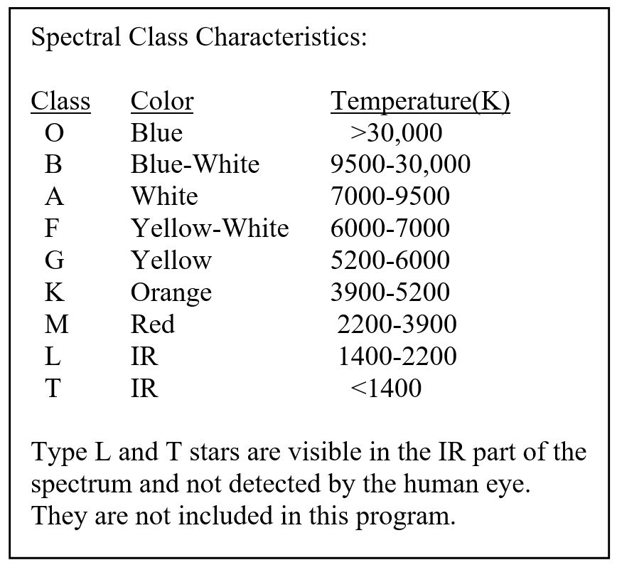 By the end of 5th grade school children know when light passes through a prism it is broken into its component colors ranging from red to violet. Many of us are excited when we see a rainbow’s colors of ROYGBV. In 1802, the English chemist William Hyde Wollaston was the first person to note the appearance of a number of dark features in the solar spectrum. In 1814, Joseph von Fraunhofer independently rediscovered the lines and began a systematic study and careful measurement of the wavelengths of these features. Today we recognize that the colors and lines are part of an area of knowledge known as spectroscopy, the branch of science concerned with the investigation and measurement of spectra produced when matter interacts with or emits electromagnetic radiation. Spectroscopy makes use of an instrument called a spectrograph to produce the colors (spectra). A spectrum can be analyzed to produce a spectrogram, a visual representation of the spectrum of frequencies as they vary in intensity. Most of what we know in astronomy is a result of spectroscopy: It can reveal the temperature, spectral class, and composition of an object as well as be used to infer mass, distance, luminosity, relative motion using Doppler shift and many other pieces of information. Spectroscopy is done at all wavelengths of the electromagnetic spectrum, from radio waves to gamma rays, but this program will focus on visible light. The radio frequencies are addressed in the Astronomical Leagues’ Radio Astronomy Observing Program. Through the work of Indian astronomer Meghnad Saha and others, it was realized that a primary difference between stars was their temperature, and so the classification scheme was organized into “OBAFGKM” based on temperature, from the hot O stars that cause most of the surface Hydrogen to be ionized to the cool M stars that are unable to excite Hydrogen’s electrons at all. Thus, we see different features for different classes of stars as shown in the tables below: |