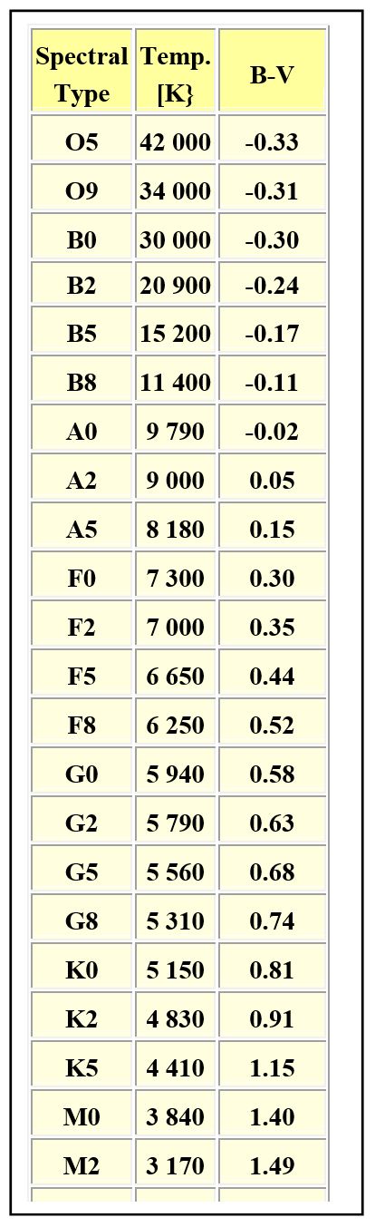 A second method performs photometry of images taken with photometric filters, usually B and V. The table below shows B – V values for various stellar classifications. While this method can be used to determine a wider range of classes, the cost of photometric B and V filters places this method beyond the scope of this program.