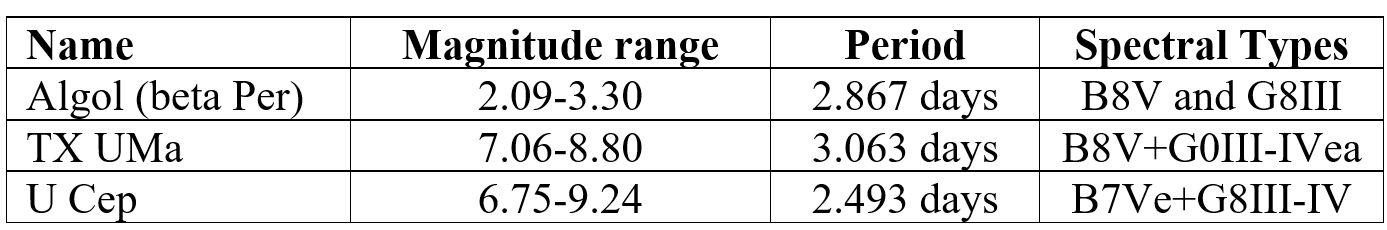 To help pick spectroscopic eclipsing binary stars to verify go to the “TIDAK - TIming DAtabase at Krakow“ web site (http://www.as.up.krakow.pl/ephem/) and/or the "Ephemerides of Variable Stars" (http://www.motl.cz/dmotl/predpovedi/). You will use these databases to pick the stars you wish to verify because it will give you predictions of the best times for your observations. Select a constellation and look through the list noting the magnitudes and periods. Select eclipsing binaries that have magnitudes that are possible with your equipment based on your experience collecting data for the stars you choose in Part I. Eclipsing binaries with short periods can be done in one evening. Click an eclipsing binary and note that the new page gives a number of primary and secondary minima times for the next few days or weeks. A primary minimum is when the primary star (the brightest of the pair) blocks the light from the secondary star (the dimmer of the pair). A secondary minimum is the opposite. You should image the eclipsing binary near these two times. If the primary and secondary stars are different stellar types, it may be possible to note a change in the spectra. By clicking on the Simbad link on the page it is possible to see the Spectral Type. Select your five eclipsing binary stars so they have different spectral types as far apart as possible. Since you won’t have to note the maximum wavelength any star type can be used. While not specifically required Algol (beta Per), TX UMa, and U Cep are good examples. Negative observations are permitted since this is dependant on the resolution of your spectrometer.