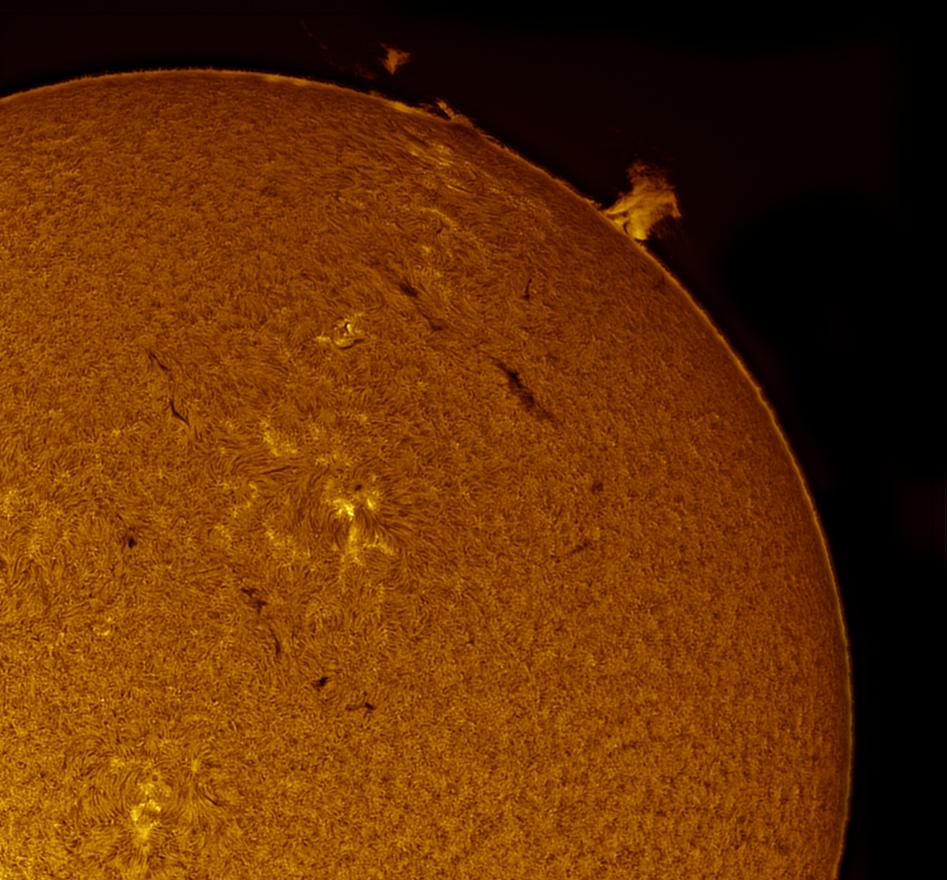 The prominences were also stacked from a video with longer exposure times on individual frames. Video frames were cropped and aligned in PIPP, and stacked using the Autostakkert2! software.