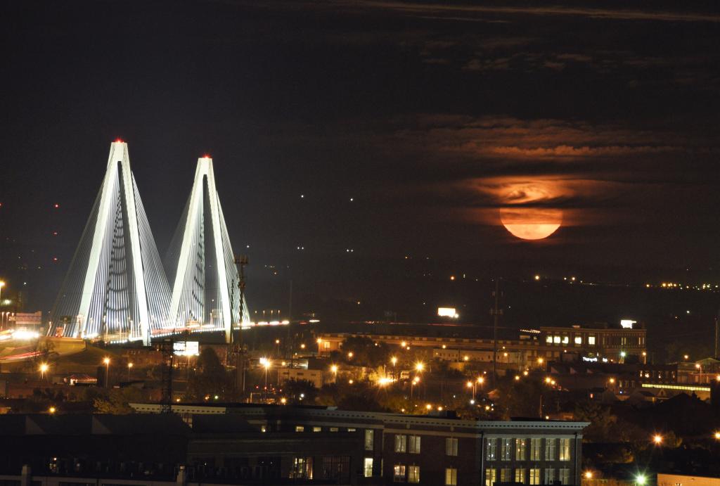 Steve captured the rising "super moon" near Stan Musial Veterans Memorial Bridge in St. Louis on November 16, 2016. He used a Nikon D750 with a Nikkor 28-300 mm lens set to 300mm, f/16, 1.6 second exposure, ISO - 1600.