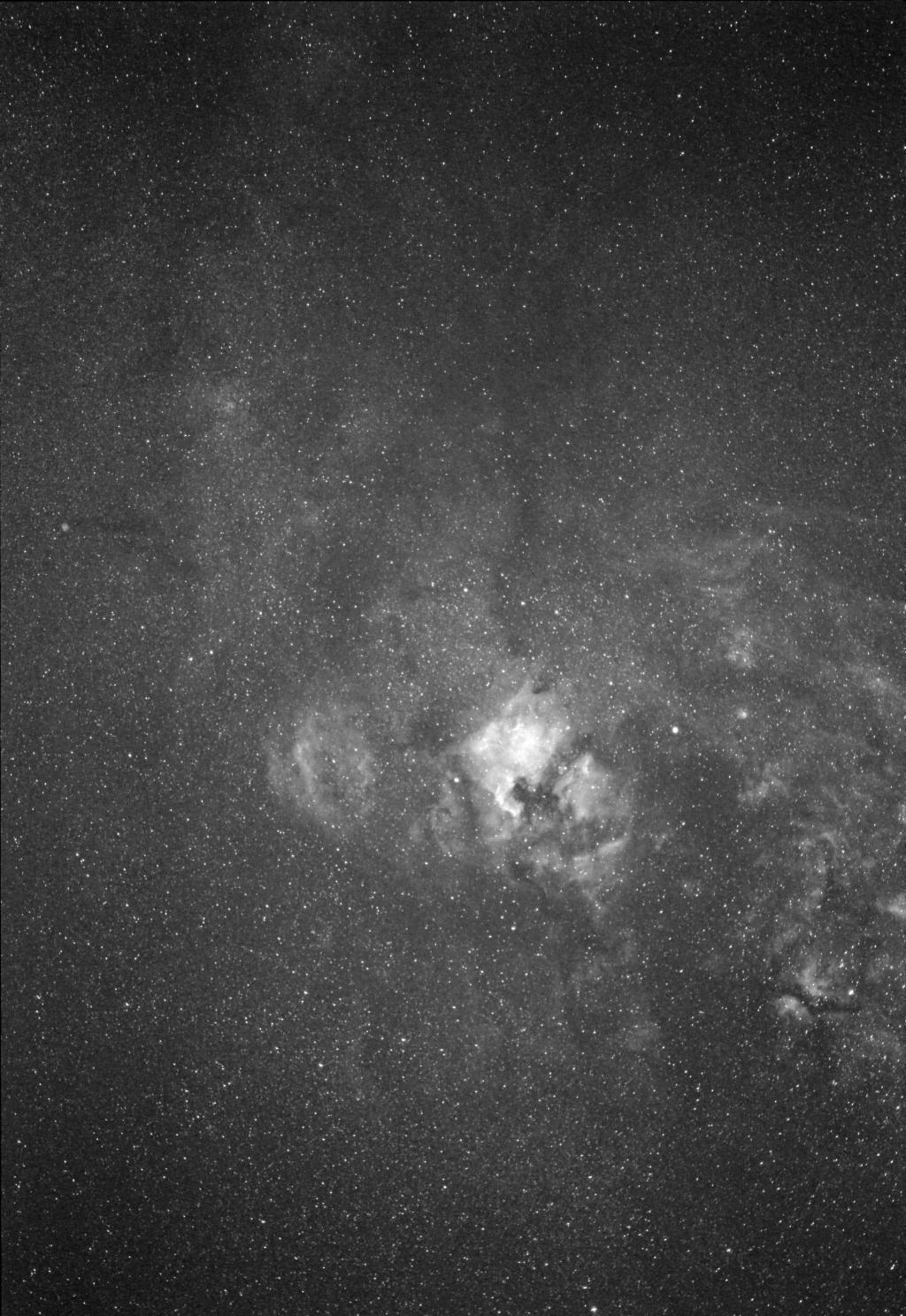 Photo taken with a Hydrogen Alpha filter with Canon 6D with an 80mm lens.  It is comprised of 12 shots at 5 minutes at ISO 10000.  The two brighter stars are Deneb and Sadr in Cygnus and the main nebula are the North American Nebula and Pelican Nebula.
