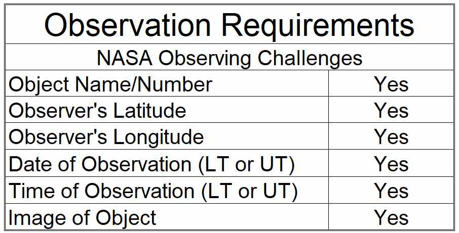 IntroductionThe Astronomical League has been working with NASA to bring you Observing Challenges. These are opportunities to participate in events associated with space missions to objects within the Solar System or related to celestial events. New opportunities will be added as new milestones for various missions or noteworthy celestial events occur.