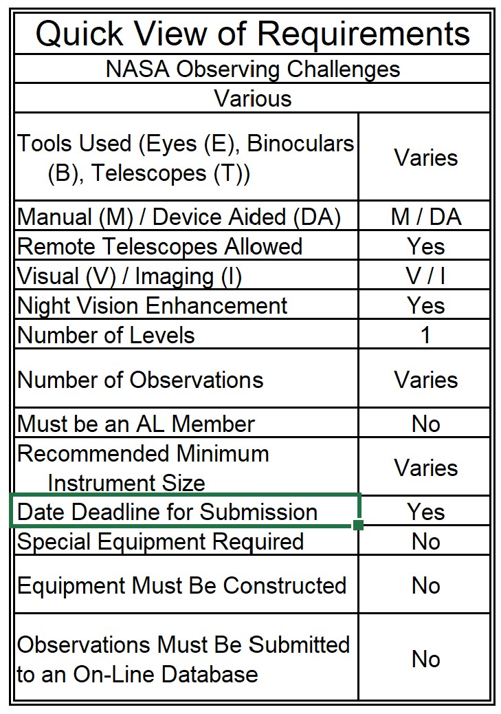 SPECIAL NOTE: If you are looking for information regarding the Observe the Moon Night Observing Challenges, they are listed as AL Observing Challenges since they are celestial events rather than related to NASA Missions. Click here to go to that web page. They are done in conjunction with NASA though.